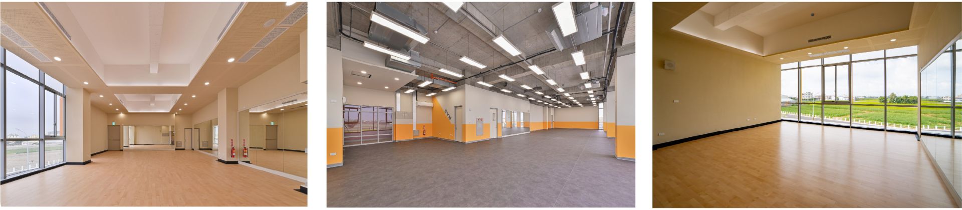 多功能教室採用大面積落地玻璃介面,大幅引進自然採光與田園視野 。